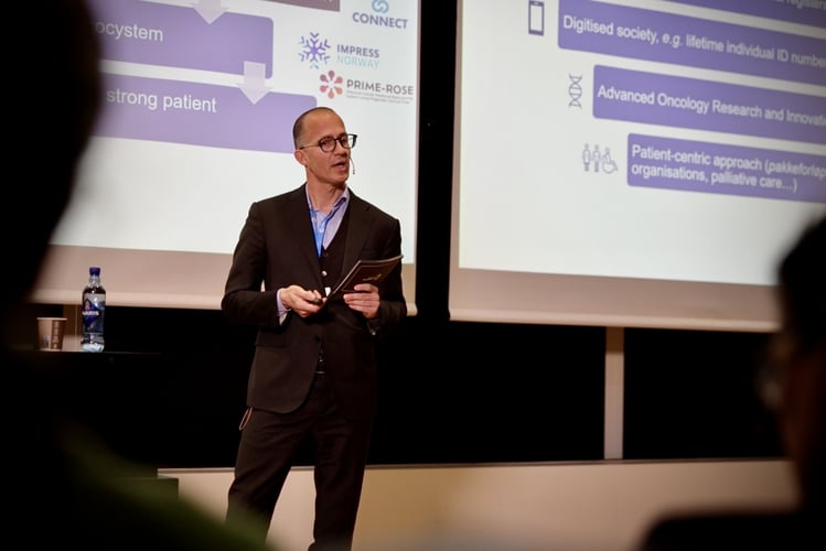 Den andre hovedforedraget ble holdt av Mark Lawler, assosiert pro-viserektor, professor i digital helse, og leder for translasjonell kreftgenomikk ved Queen's University Belfast. Han snakket om forskningsprosjektet European Groundshot: Å tenke nytt om kreftforskning og implementeringen av det over hele Europa.